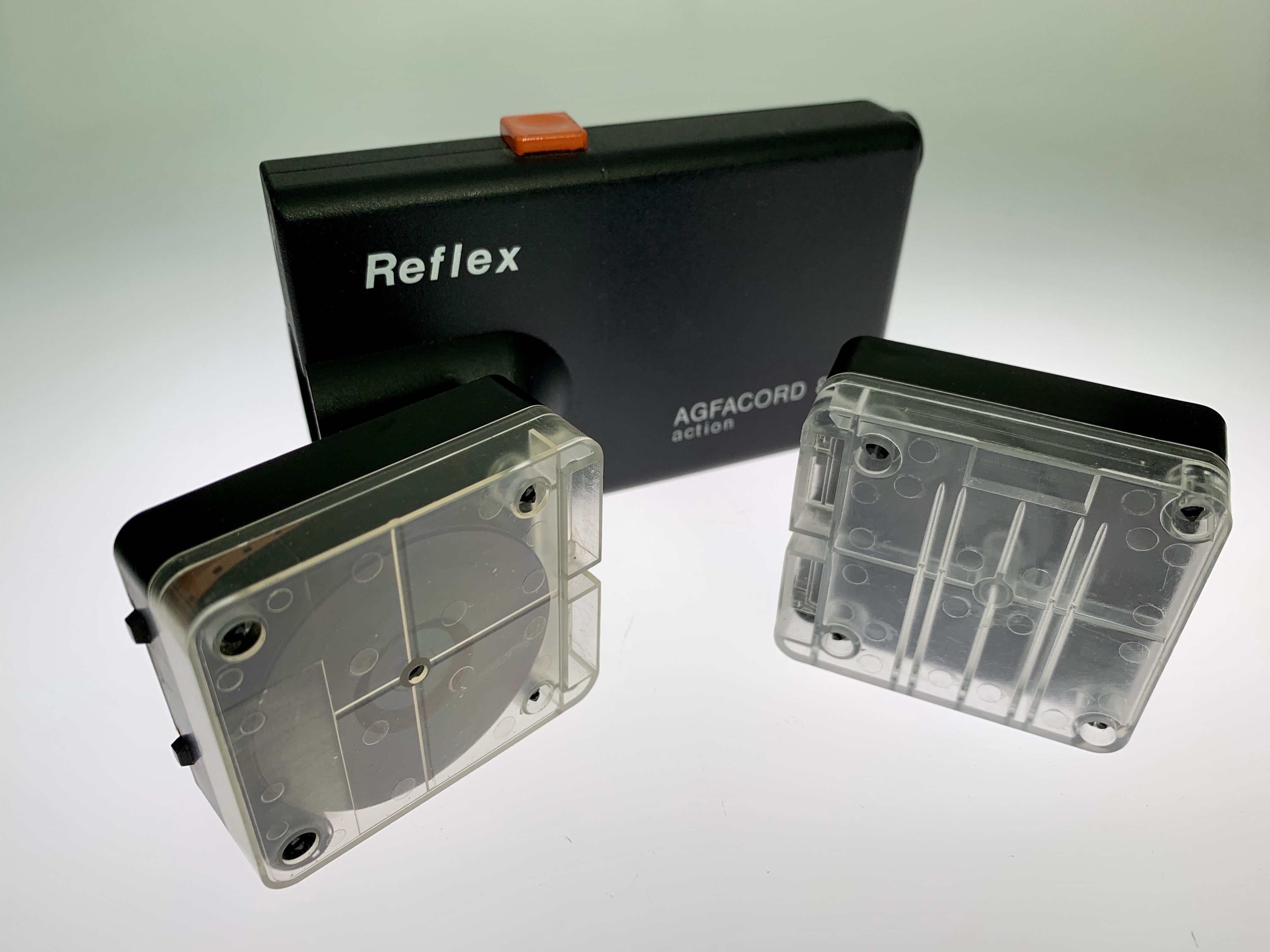 Doch richtig klein kann die Filmkamera mit der klobigen Super-8-Kassette, die Kodak 1964 in den Markt gebracht hat, nicht sein. So machen sich die Ingenieure an das Undenkbare – eine kleinere Kassette. Und tatsächlich sind die vorliegenden Prototypen ein Drittel kleiner, in der Höhe wie in der Breite. Stellt man sie neben das Modell der Agfacord 80 merkt man, dass die Kamera schon noch einen Zentimeter dicker sein müsste, um die veränderte Kassette aufzunehmen. Aber immerhin, ein Anfang war gemacht. Möglich ist dies nur, weil Agfa Film auf Polyesterträger in die kleine Kassette füllen will. Im Prototyp steckt dieses Material bereits drin, 15 Meter, genauso lang wie beim großen Bruder Kodak. Bislang hatte Agfa, wie auch bei Kodak üblich, Filme auf Acetatbasis hergestellt, die rund ein Drittel dicker sind als Polyesterstreifen.