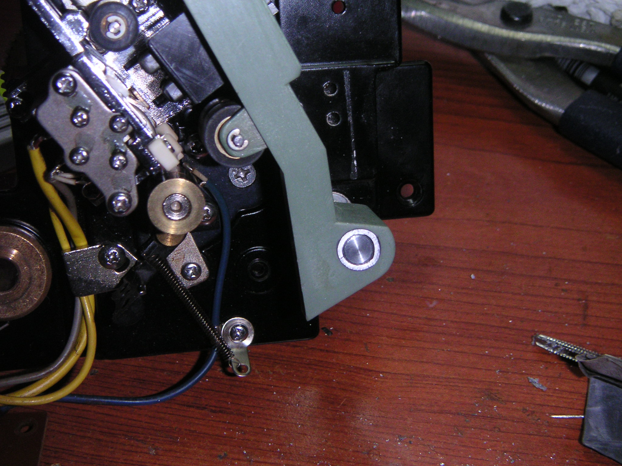 The lever is designed to exert between 250 – 300 g of force to hold the film against the heads. In the first version of this lever, the metal shaft is affixed directly into the plastic. After years under pressure, the plastic often cracks. This causes a lack of pressure against the playback heads, leading to serious sound playback problems. If left unattended, the plastic around the shaft will disintegrate completely.